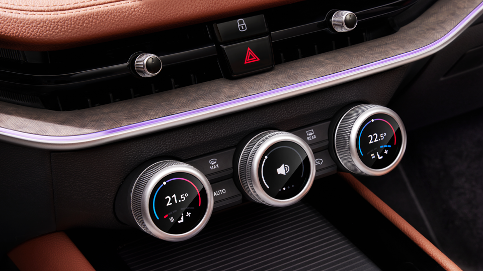 With the three Škoda Smart Dials, which are located between the infotainment display and the centre console, haptic controls have been installed in addition to the touch elements. They can be rotated and pressed and control access to important functions such as air conditioning or volume.